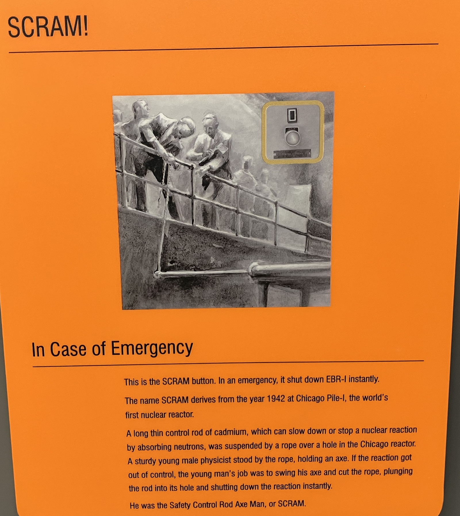 I’m not sure if I believe the commonly told story about the origins of the SCRAM label, but it’s certainly a frequently told story! I lean a bit more towards “Hit the button and get out of there” as origins, but… you’ll hear the story on just about any nuclear tour. Wikipedia has some useful history on the term.