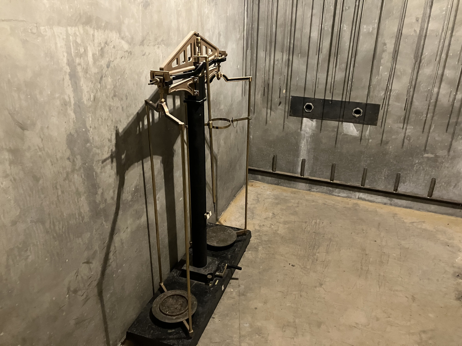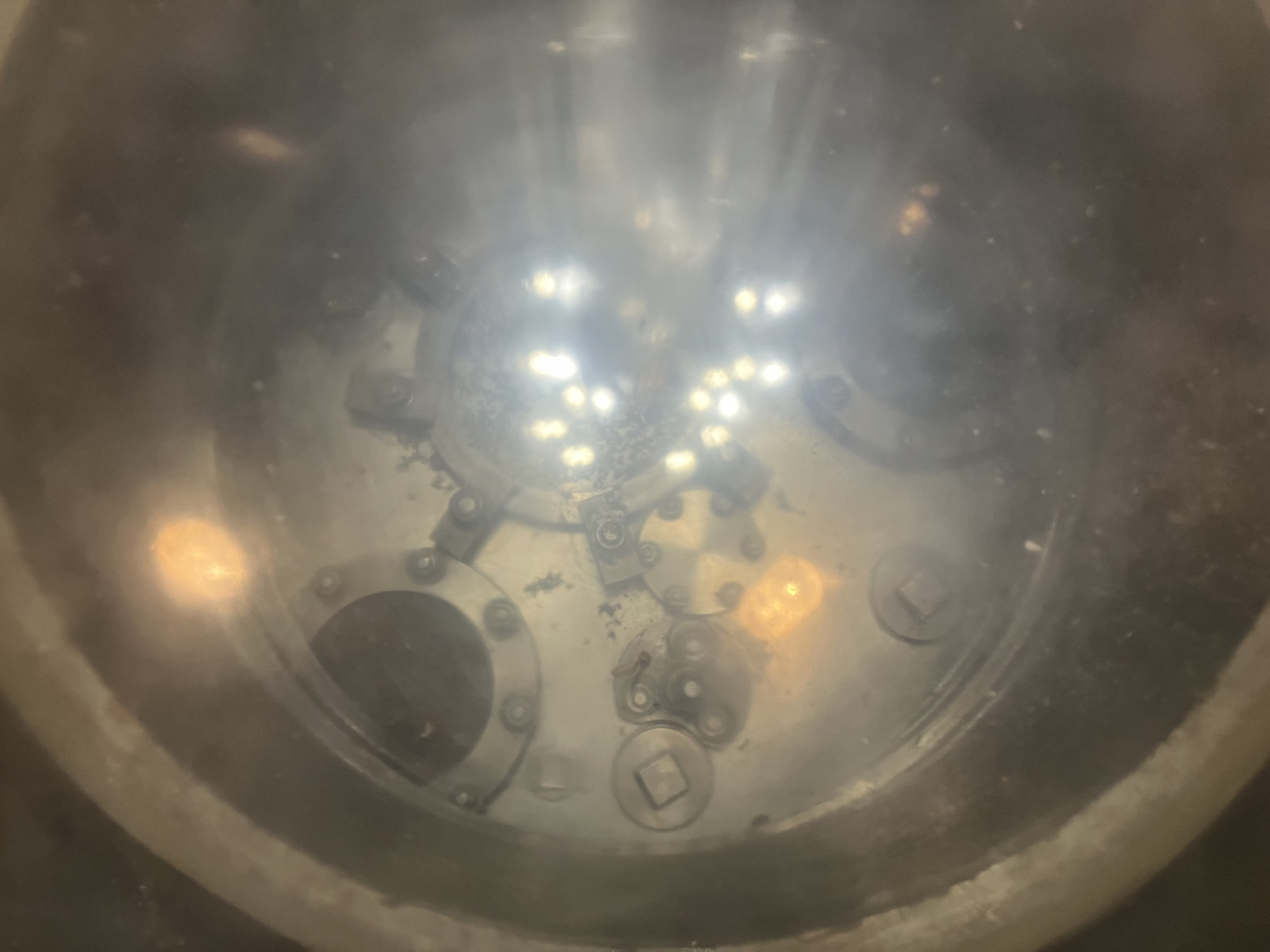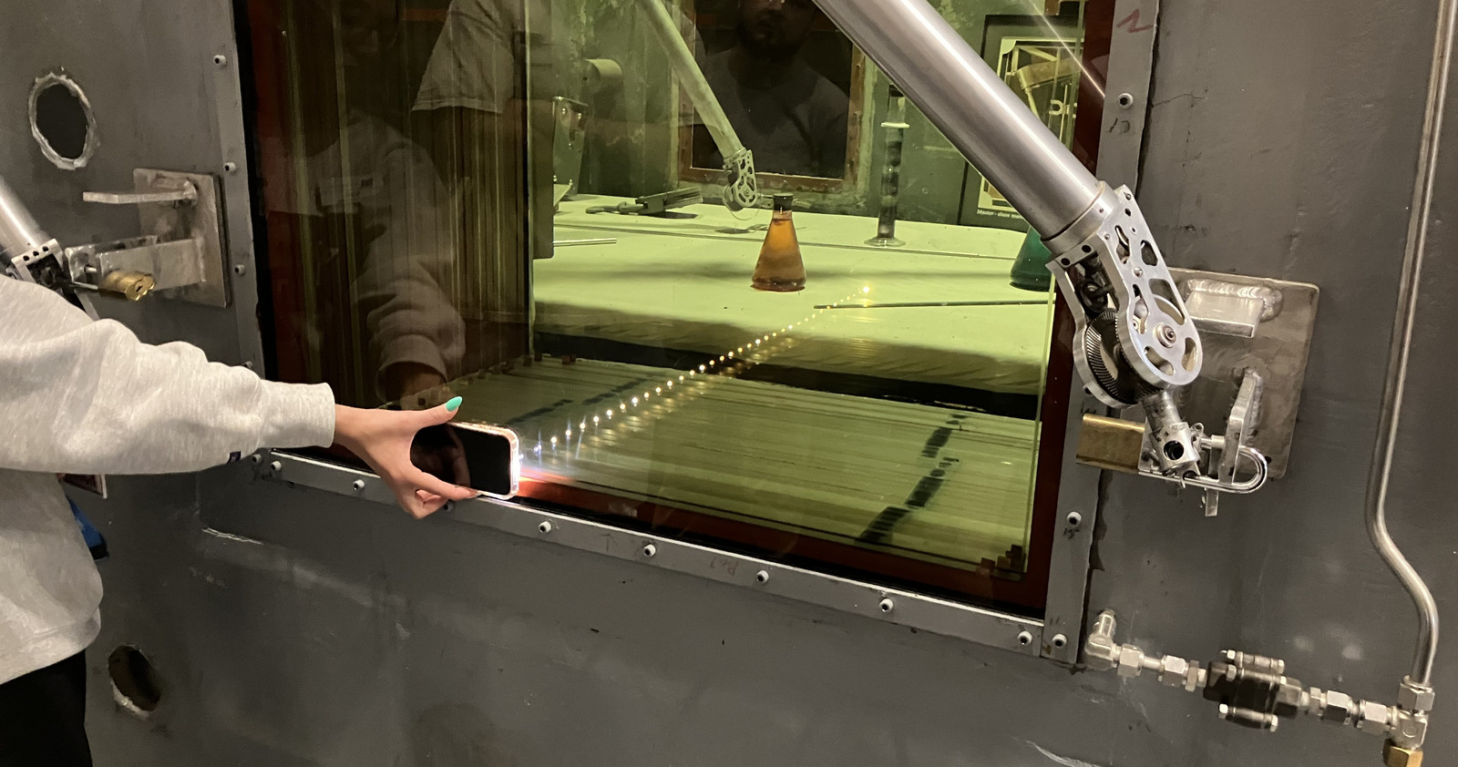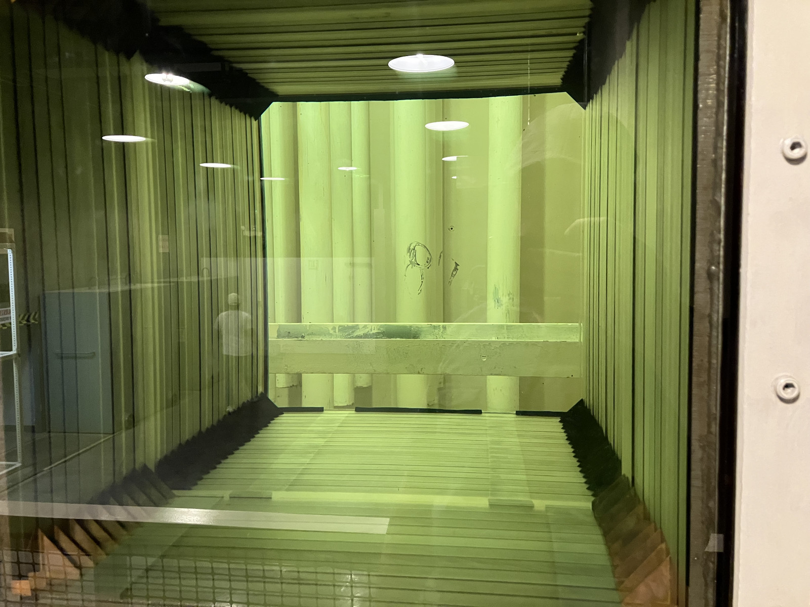 The windows are 34 layers of leaded glass, flooded with mineral oil between each layer. The result is a meter-thick window you can see, reasonably enough, through - though I’ve no idea how bright it actually is, in the hot cell. In the basement, a similar chamber with similar windows required quite a few high intensity sodium lights to make it workable. You can see, here, the reflection off each and every pane of glass from someone’s cell phone flashlight.