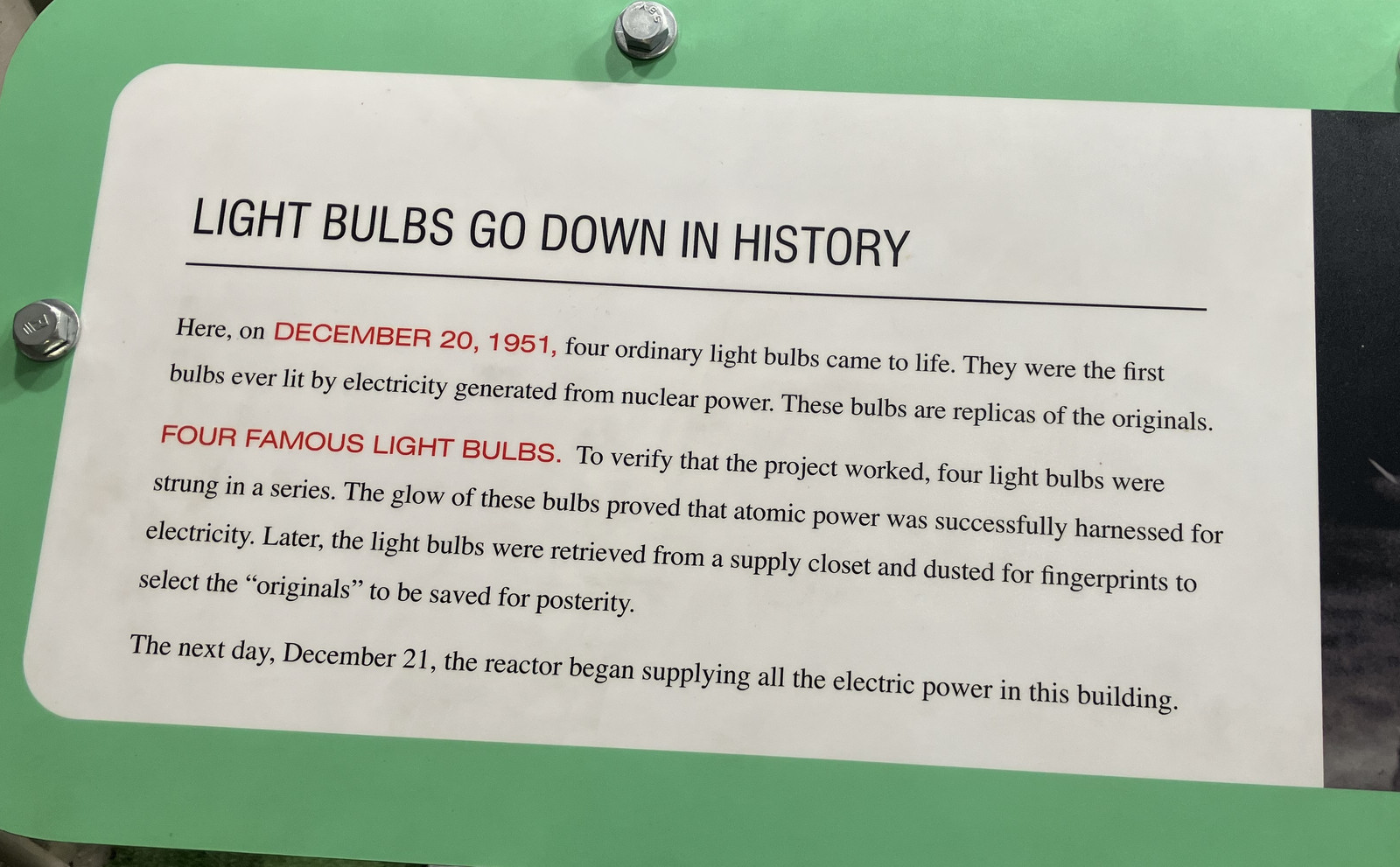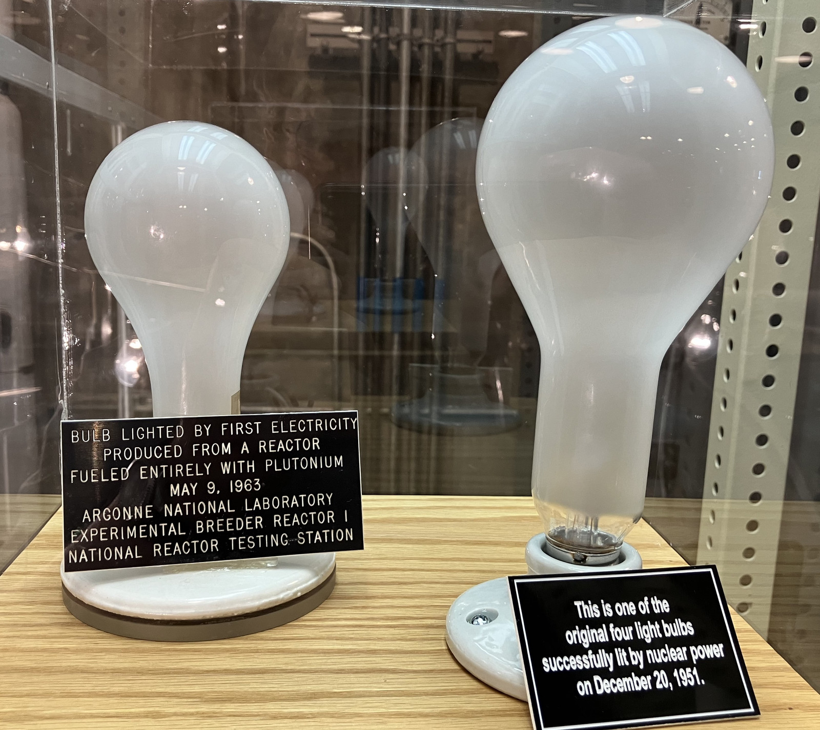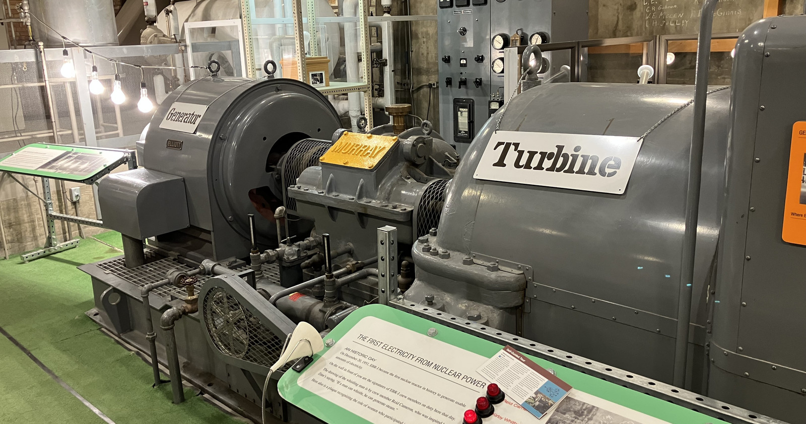 EBR-I is probably most famous for the string of four lights lit up on nuclear power (800W of load). What I didn’t know before, and what I appreciate so much about the people involved, is that they didn’t think anything of it at the time! They did the test, and then put the bulbs back in the supply closet, requiring dusting for fingerprints to try and identify the “original” bulbs used to present to various people (including the President).