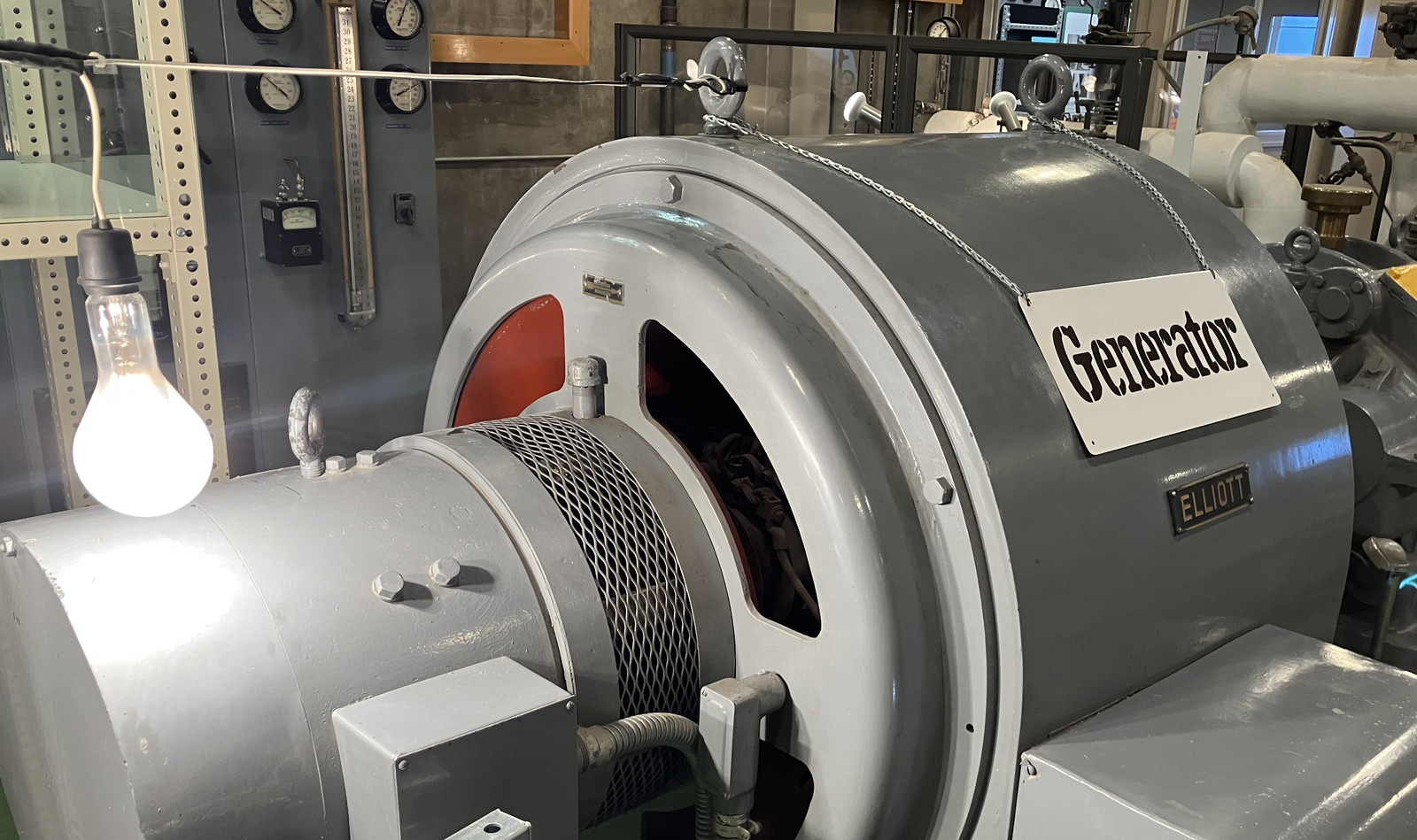 Outside the control room, on the second floor, is a rather cute steam turbo-generator. I’d say massive, but… really, it’s not that large. This is a 375kVA unit, which just isn’t that big as far as generators go. it works out to about 500 horsepower. On the far end, you can see a string of four light bulbs, as EBR-I is rather famous for. Why four bulbs? The generator puts out 480VAC - and so, 4 120V bulbs in series works happily on 480V!
