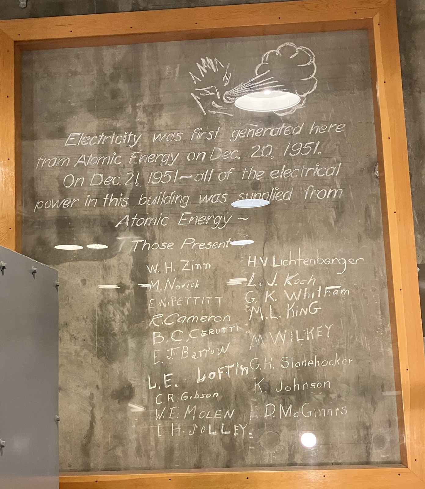 Despite not bothering to save the lightbulbs as anything special, there was some sentiment that, perhaps, this event (powering the building from nuclear power) might be something worth remembering. So, after doing the thing, someone got a ladder and made a memorial on the wall behind the turbo-generator. This has, later on, been protected by a good picture frame, but for 74 year old chalk-on-building-wall, it’s in very good condition! I just appreciate 1950s engineer handwriting, and it’s a thing I really ought learn.