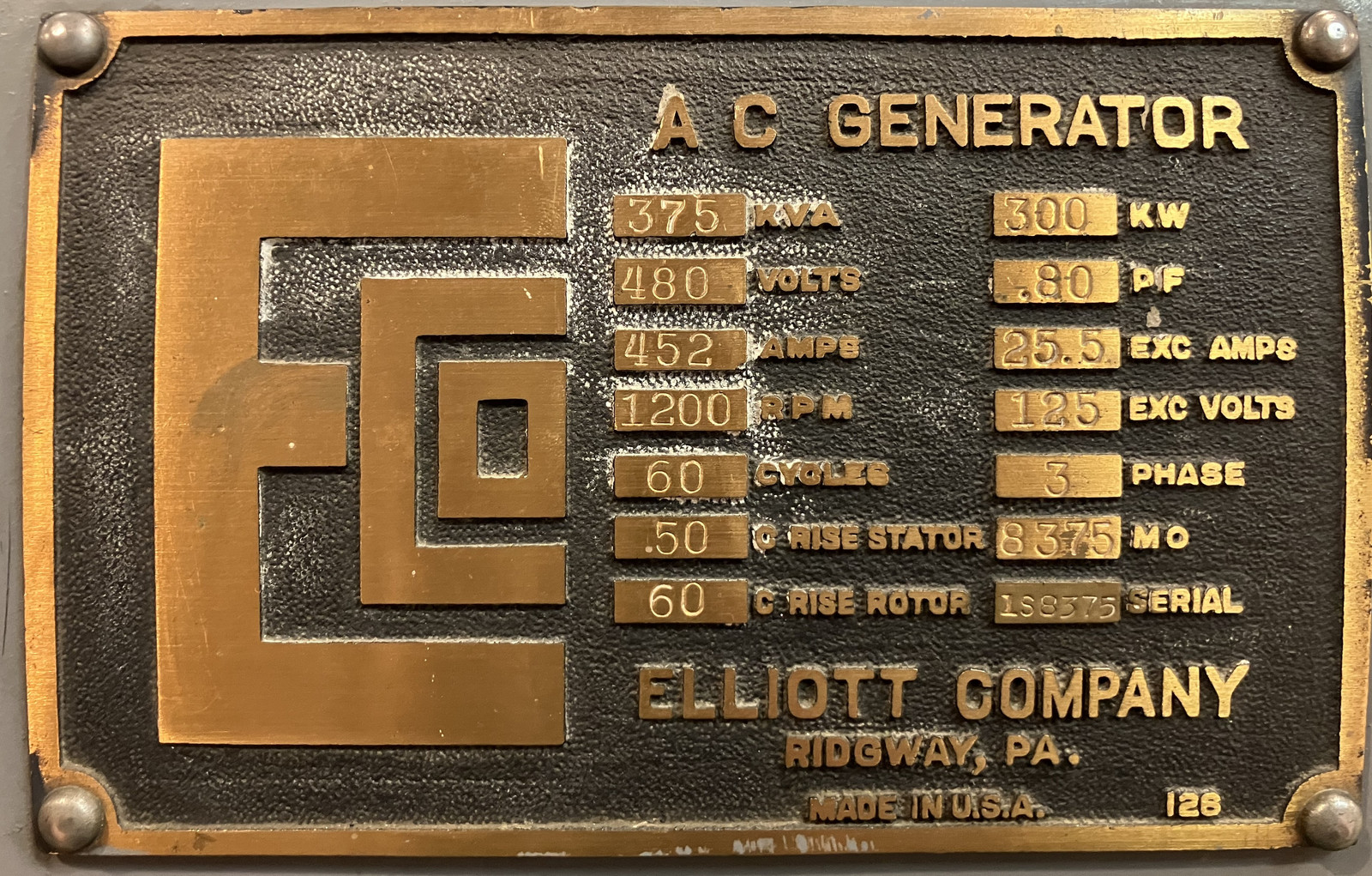 I love finding the old data tags on equipment like this. The generator is an Elliott 8375, serial number 1S8575. It’s a three phase 480V generator, and the exciter needs 25.5A at 125V to provide the field the rest of the unit works against to make power. And, it looks like you should keep the rotor temperature rise under 60C, and the stator rise under 50C. I don’t for a second believe that decimal point is anything but a random spot…