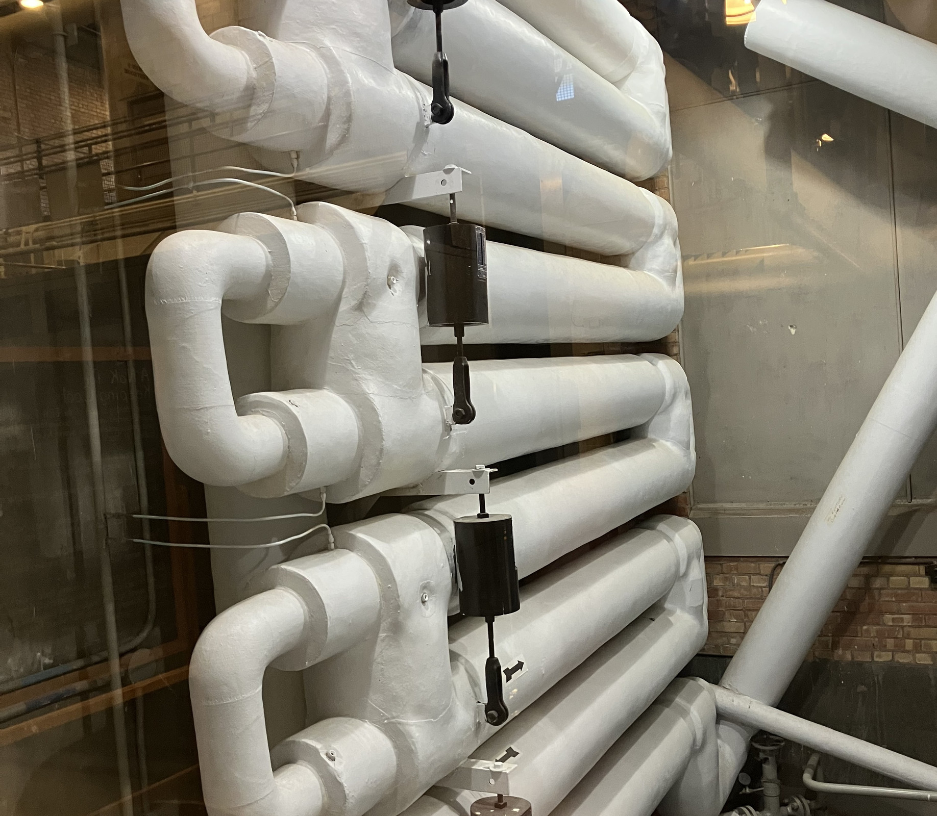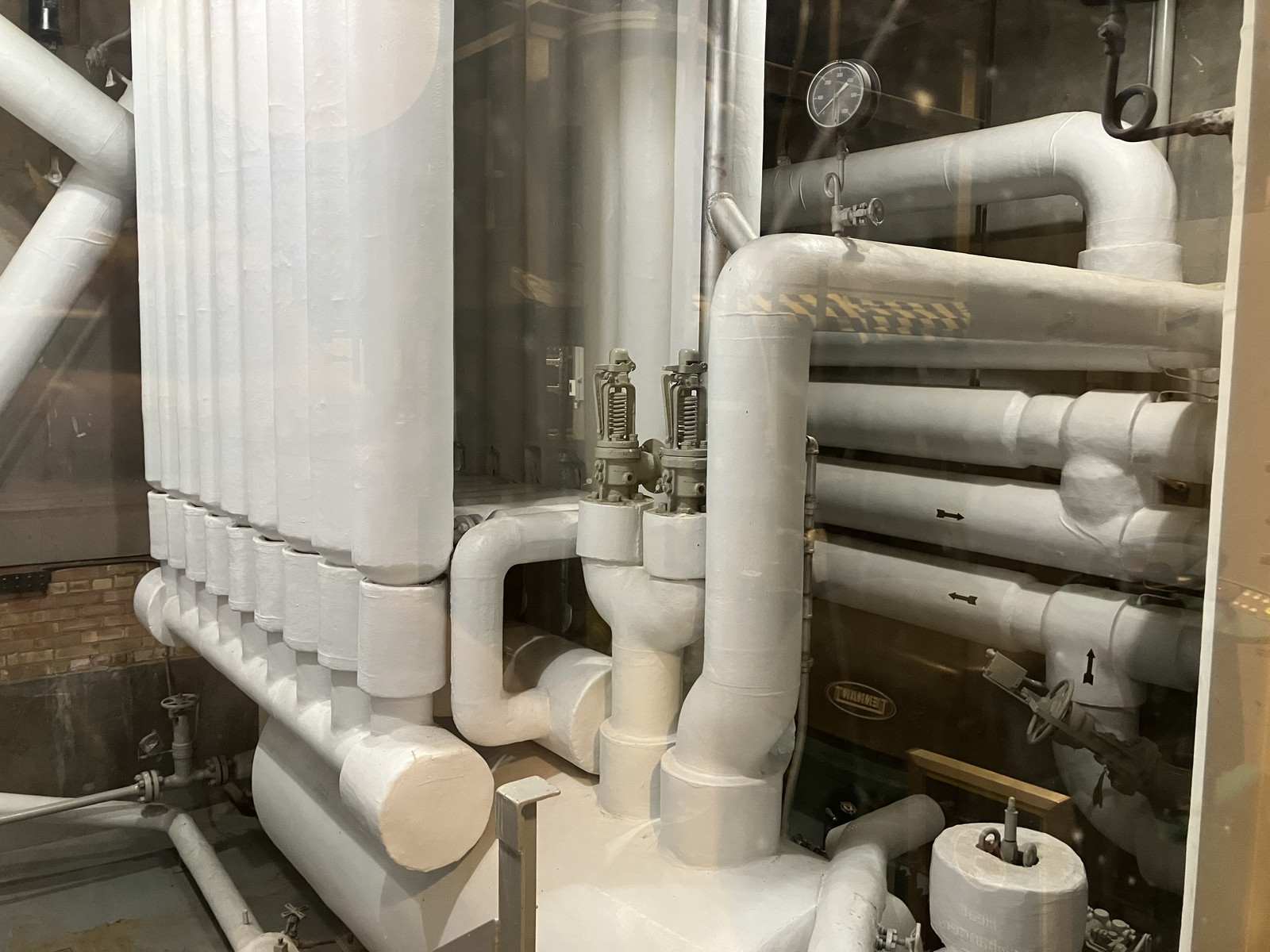 Continuing on the mechanical tour, a hole has been cut in a wall to allow a view of the heat exchangers. These are apparently still “mildly radioactive,” so not something you can get up close to. These transfer, in the multiple stages discussed above, heat from the reactor into a water loop that makes steam to run the turbine. The heat exchangers are of the “nested tube” variety, and if I recall properly, there’s a very thin layer of argon gas (or some other inert gas) between the tubes to help ensure that nothing radioactive escapes from one loop to another. I don’t know if this is a particularly efficient setup, but, as the point of this facility was to prove concepts, this also doesn’t mater in the slightest.