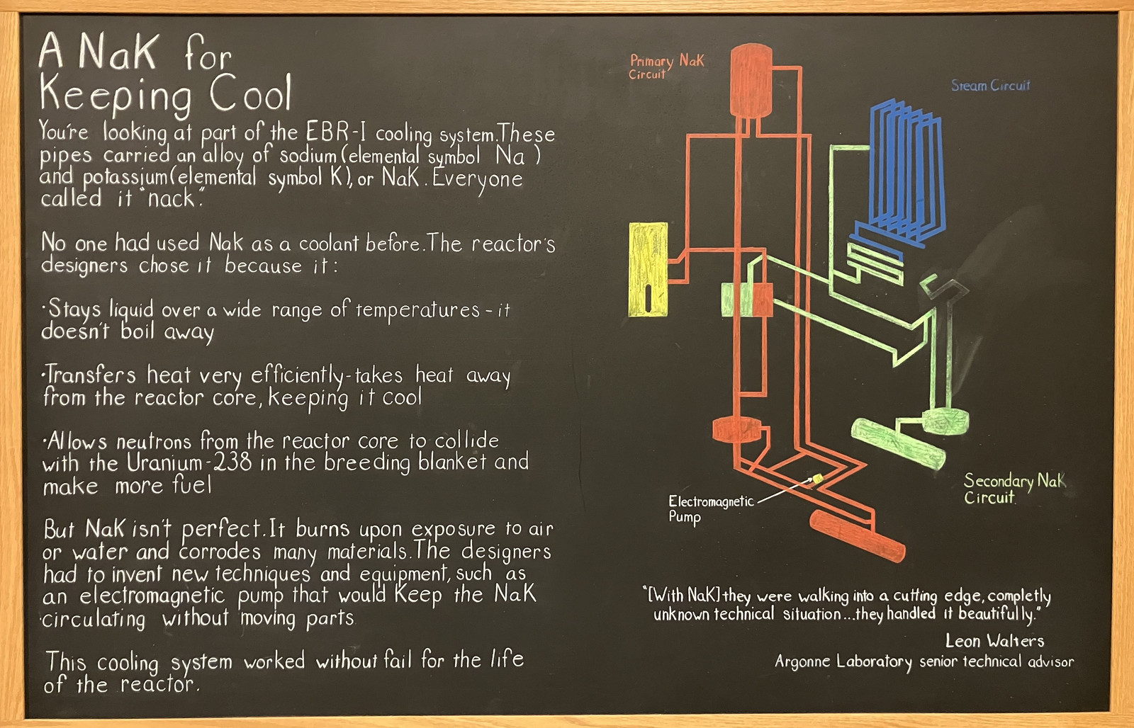 EBR-I was, in every way, experimental. It was a “fast reactor” (running on fast neutrons, not slowed/moderated thermal neutrons as most designs do), and used a quite reactive liquid metal coolant (water absorbs and slows neutrons, which isn’t compatible with fast reactor operation). They had to design new methods of pumping for it (electromagnetic pumps), various new techniques to handle the coolant on the fuel rods, and by every account did a great job of it! Liquid metal reactors have historically been touchy to deal with, but EBR-I was able to use a coolant that remains liquid at room temperature, avoiding some of the challenges of needing external heaters for maintenance. While they didn’t need to have two NaK coolant circuits, the coolant in the primary circuit ends up radioactive, and I believe the goal of the two liquid metal circuits was to ensure a very low risk of any contamination of the water/steam circuit if the heat exchangers leaked.
