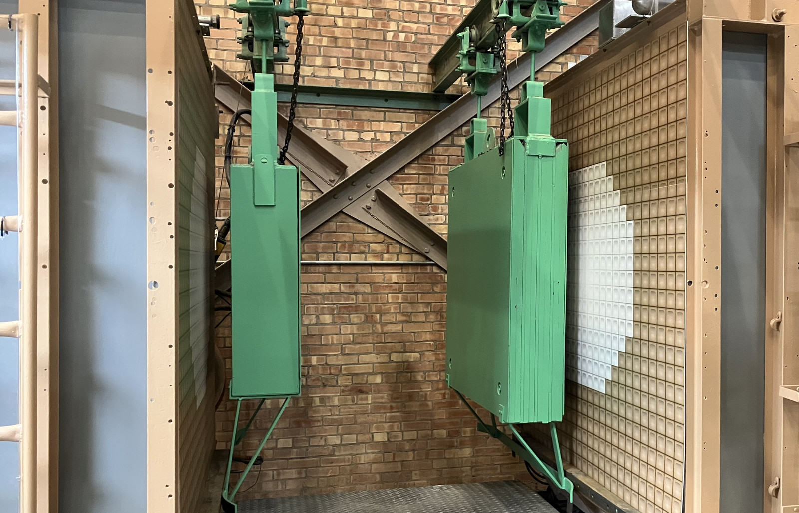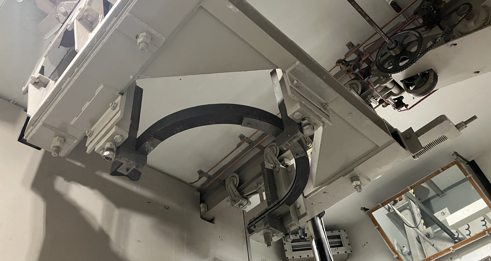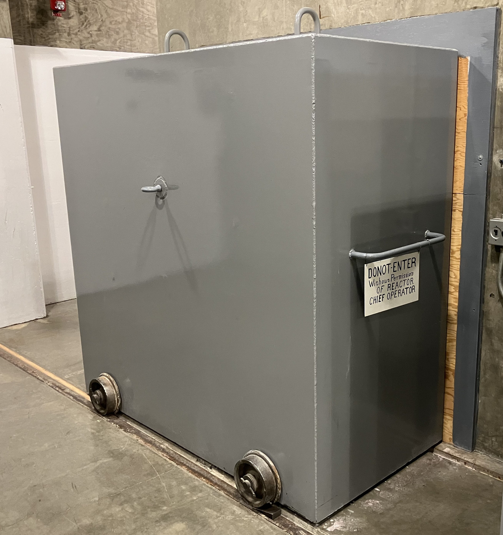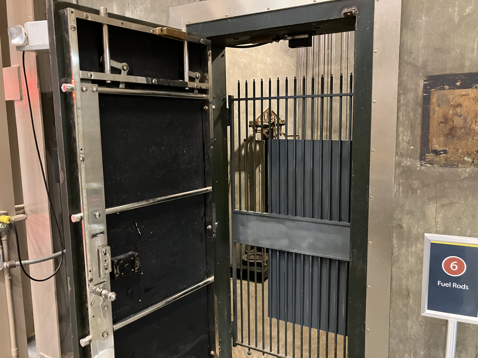 Under the core, several rooms handled the “elevator” (moving the breeding blanket up and down), and replacing chunks of this blanket, for reprocessing or repair. The doors to these rooms were simple enough: Massive metal (probably lead) blocks, on rails. These were blocked in place with wood and wedges, so I couldn’t figure out just how much effort these took to move, but I expect it was not a one man process. Someone could probably calculate how much each of these doors weighed, but it won’t be me.