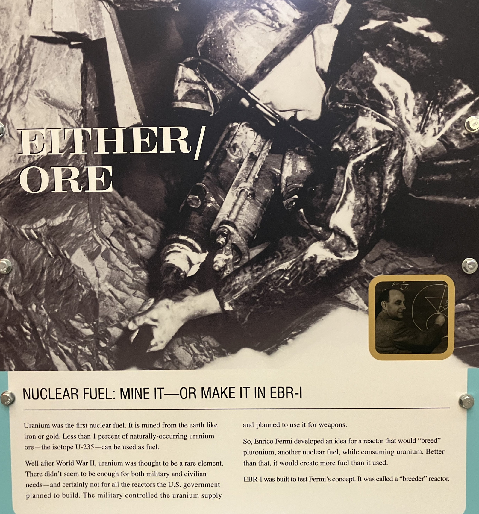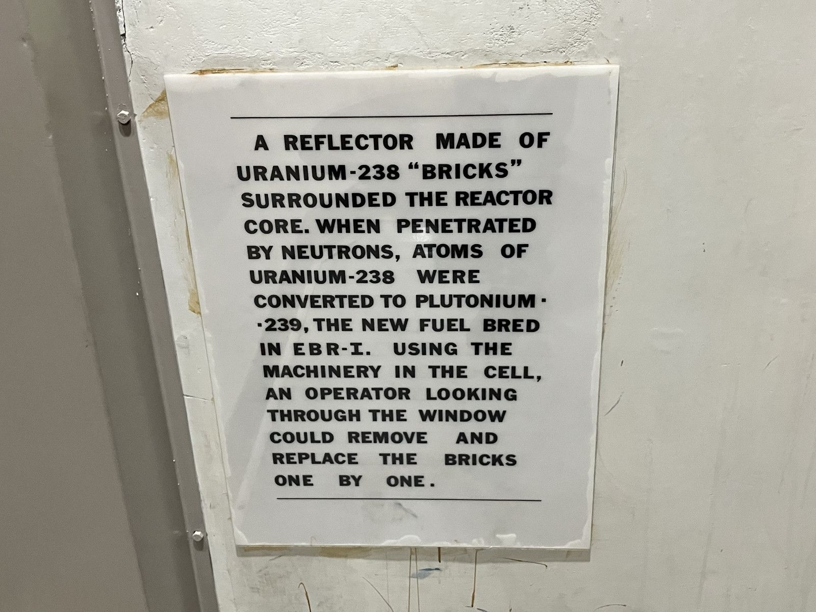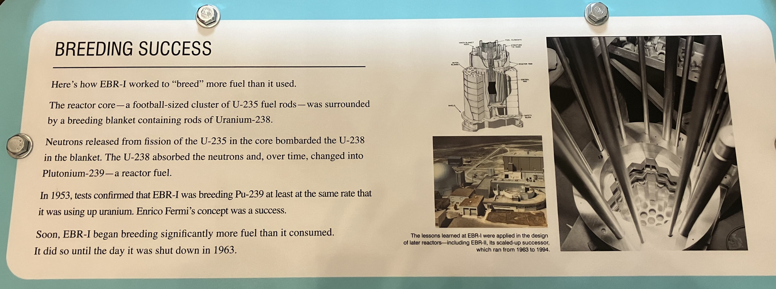 After you’ve extracted the useful U-235, you still have most of the material left, as U-238. Through the weird magic of nuclear physics, if you add a neutron to to U-238, you eventually end up with plutonium - Pu-239, which is fissionable in “useful ways.” Yes, you add a neutron and end up with more protons, and the details of that are deeper than my understanding of nuclear physics goes. But it’s been known for a while that you can bombard U-238 with neutrons and get Pu-239. The question that EBR-I was built to answer is, “Can you breed more fuel than you use?” If you react a pound of U-235 in the reactor and end up with a few grams of Pu-239, this is useful for weapons production, but not useful for “making more fuel.” Theory said that you should be able to make more Pu-239 than you actually need to run the reactor - so after your first fueling, you are able to run your reactor on “useless” U-238 (after turning it into Pu-239), and spin off an excess of Pu-239 for other reactors to run on (or to build weapons, as is often the goal). EBR-I set out to answer this question, and it turns out that it was quite successful at breeding more fuel than it used for over a decade! In addition, it was able to create some substantial amounts of usable electricity in the process.