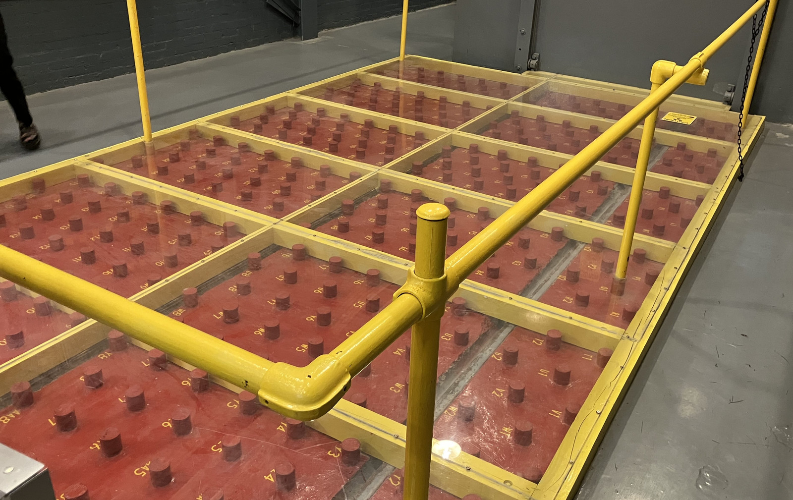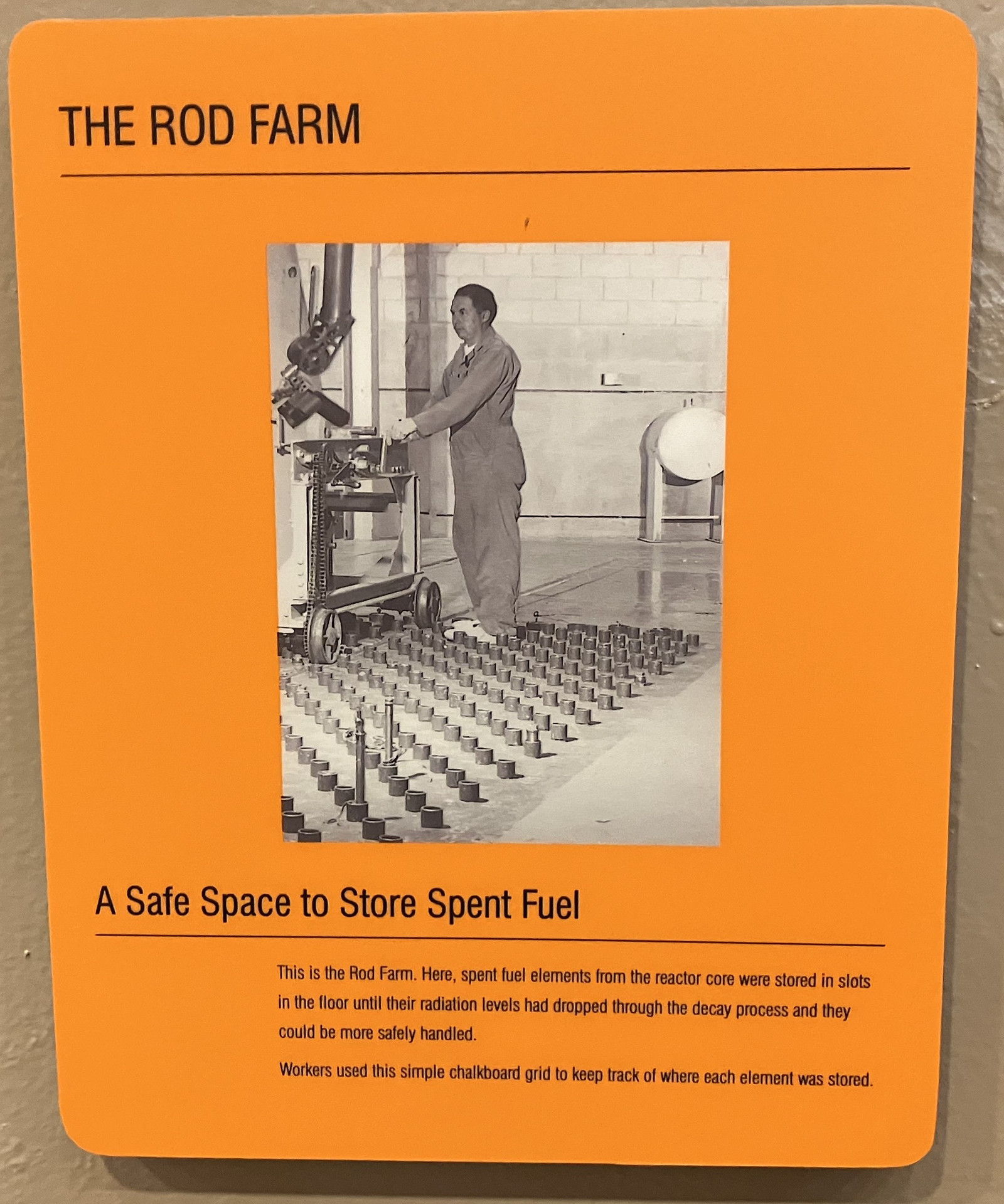 After coming out of the reactor, the rods had to chill out for a while before they were “cool” enough to do much with. First, they were washed down in the basement (I’ll get to that), and then they were stuck in tubes in the concrete floor until they’d calmed down. This was the “rod farm.”