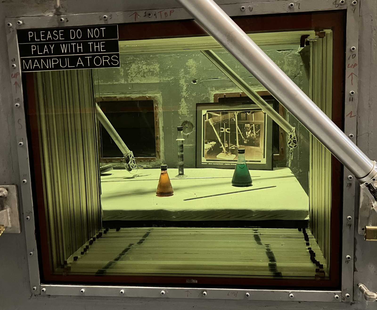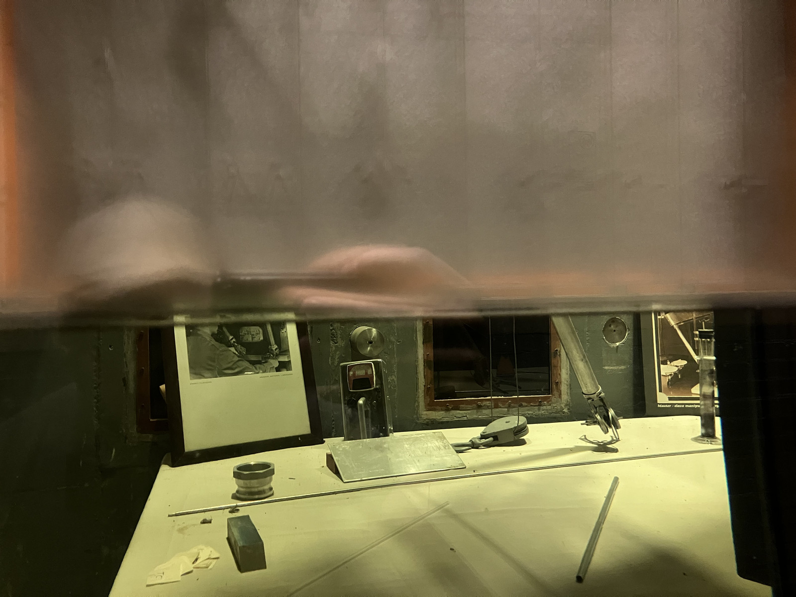 The other window, however, has leaked somewhat. The top part has no mineral oil between the panes, and while you can faintly make out the details of what’s inside (this photo fails to indicate that), it’s a hazy, foggy mess. The contrast between “air between panes” and “mineral oil between panes” is stark, and astounding. If you need to do a lot of layers of glass for whatever reason, mineral oil between the panes is the way to go! I have no idea why you’d need a 34-pane window other than radiation concerns, though. Remember, this was all before cheap cameras. You couldn’t just stuff a radiation-proof camera in the space and put a monitor outside!