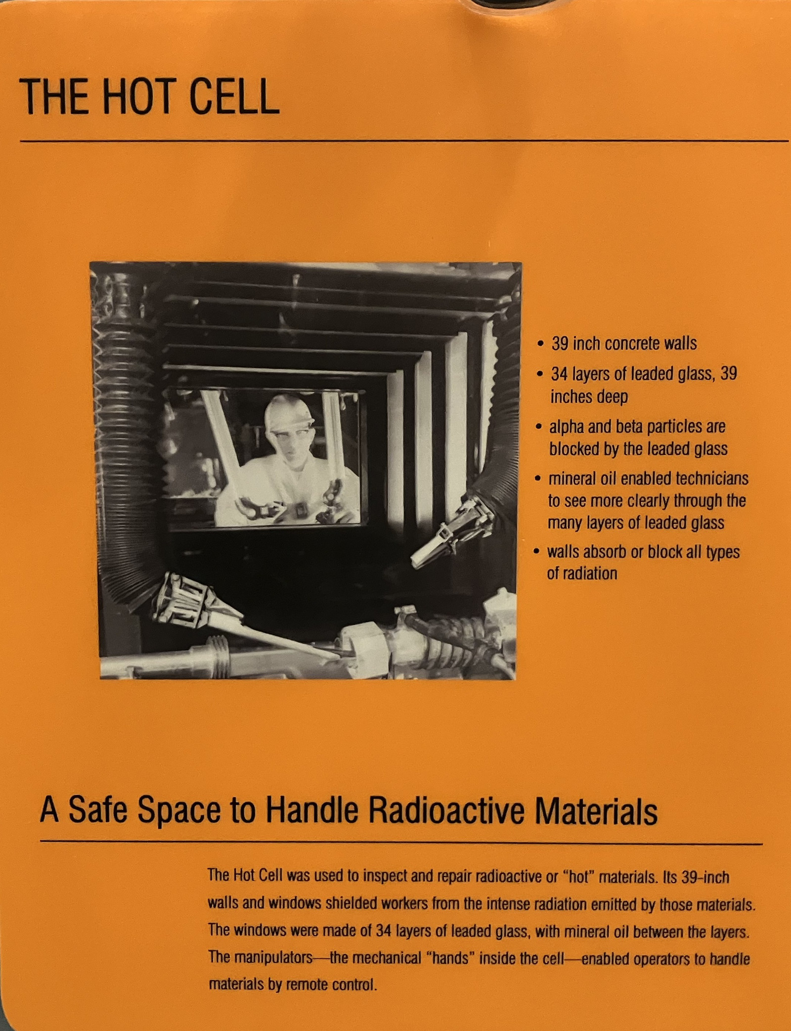 How do you deal with “hot radioactive things” in a sane manner? You use something called a “hot cell.” This is a chamber that allows you to see and manipulate radioactive things, safely enough. At EBR-I, the walls of the hot cell are 39” thick - and so are the windows, which requires some effort to make usable.