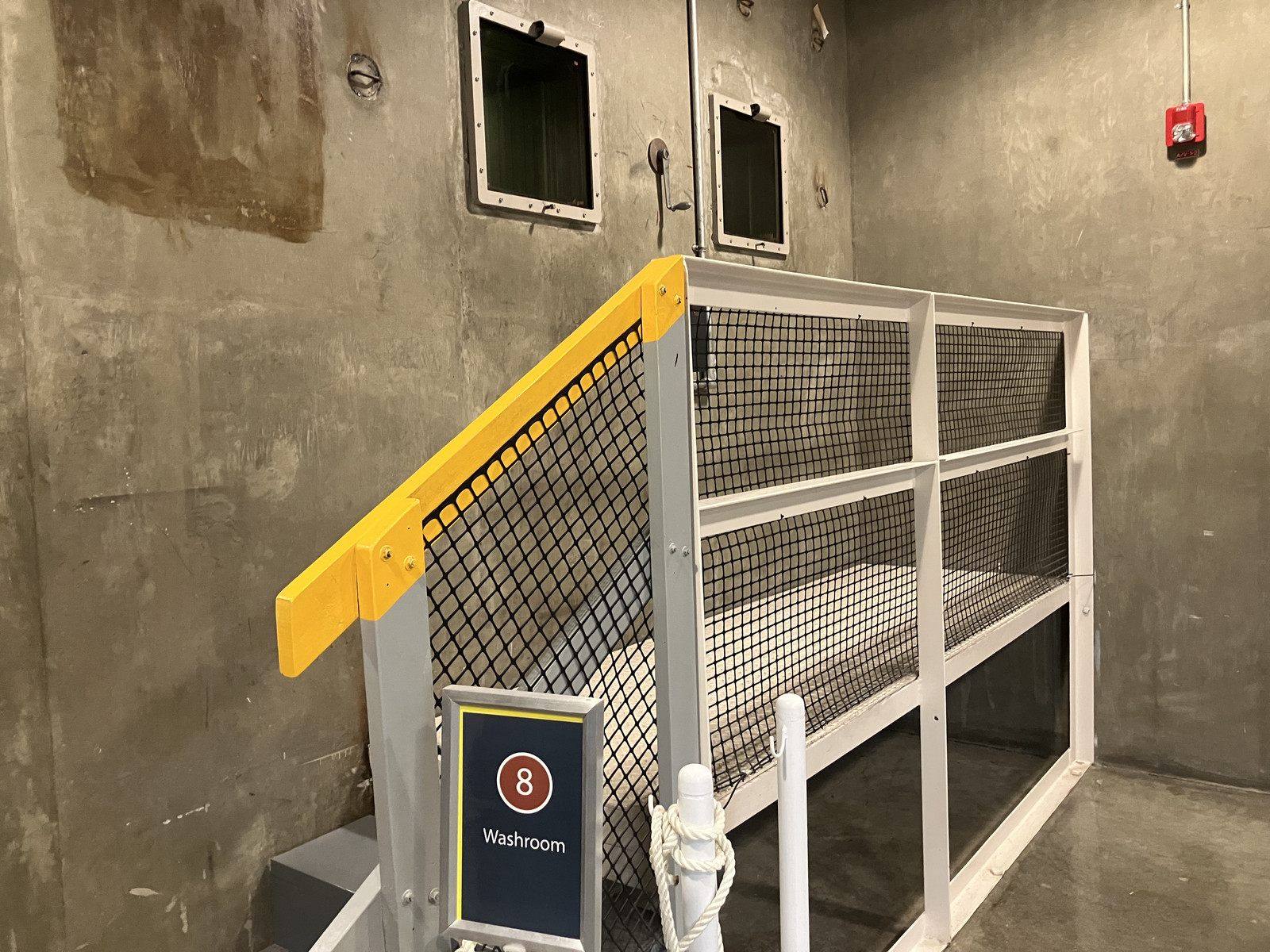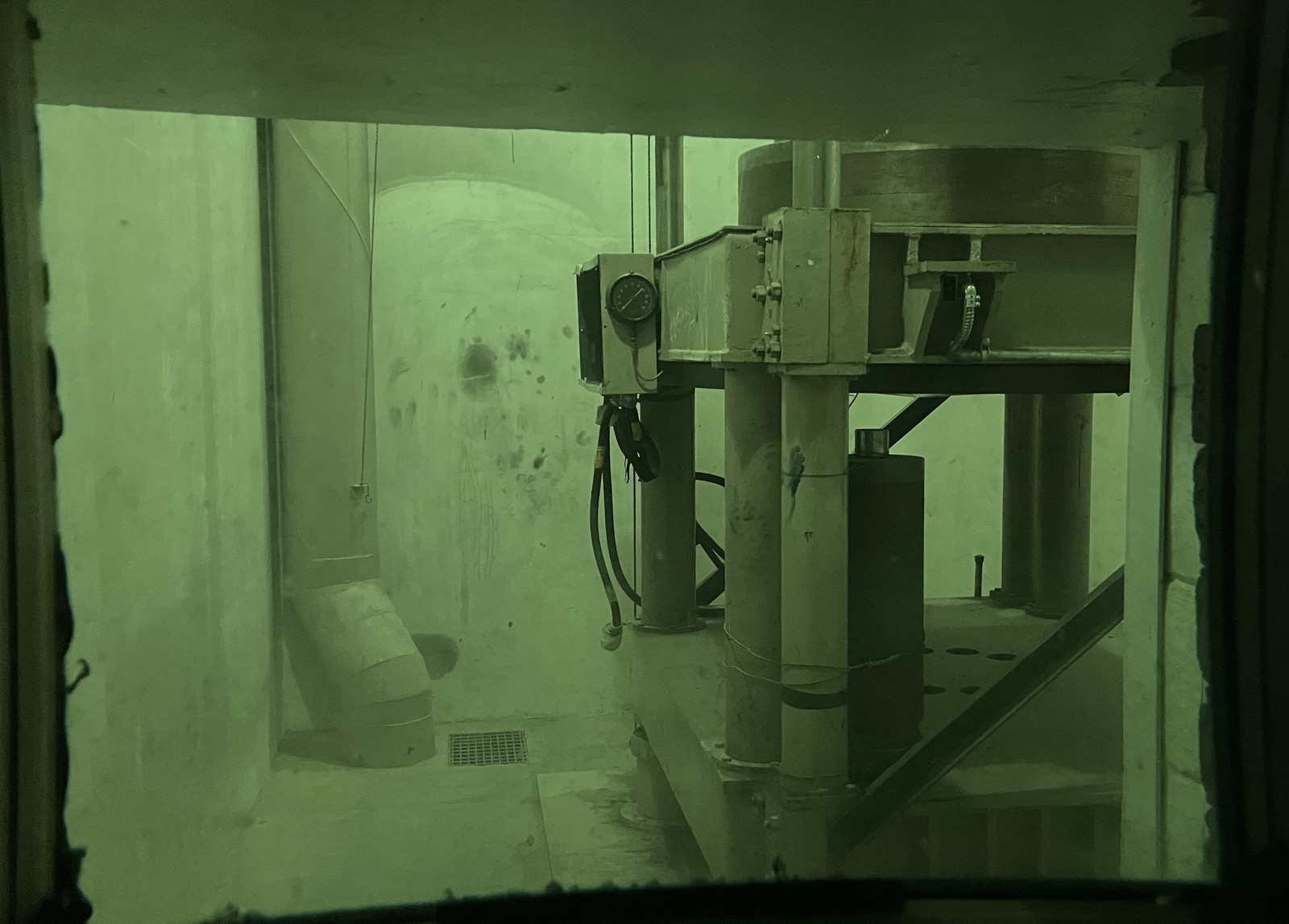 It is, instead, a chamber in which the fuel rods could be washed of their coolant. Remember that NaK interacts badly with “just about everything,” to include “air” and “water.” After a rod came out of the reactor, all the coolant had to be removed from it before you could put in the rod farm. The washroom accomplished this task. After a rod was inserted here (I’m not sure how it actually got down here), an acetone wash cycle removed the NaK from it. When that was done, the operator would start the water wash cycle. If sparks flew (literally!), they knew there was still NaK on the rod, and they’d run another acetone cycle until it was sufficiently cleaned up. This is another one of those “massively thick windows through a massively thick concrete wall” sort of viewing ports.