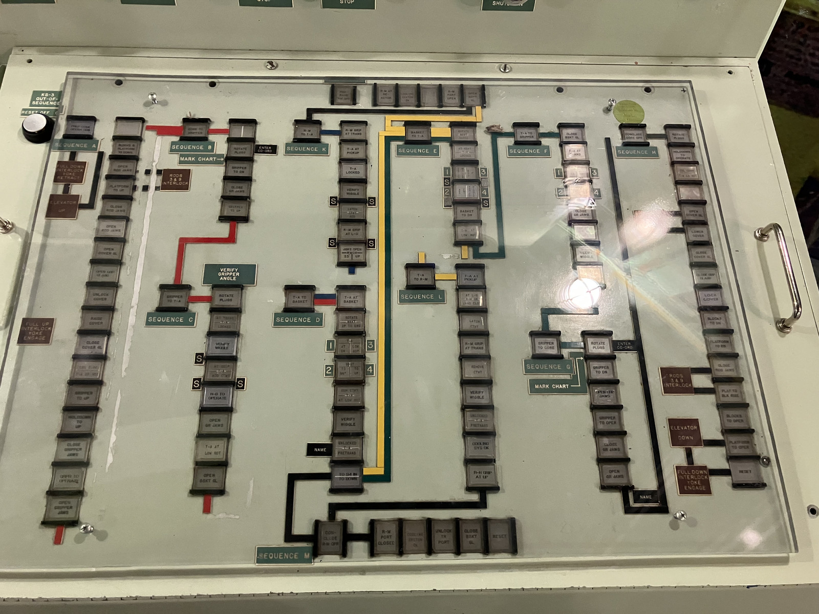 There are also some wonderful sequence control panels on display. They’re not well explained, but seem to consist of a set of steps for various processes, with labels for each stage. It seems to be an “automated checklist” sort of system, which I have to say, I like! Especially in the discrete light form!