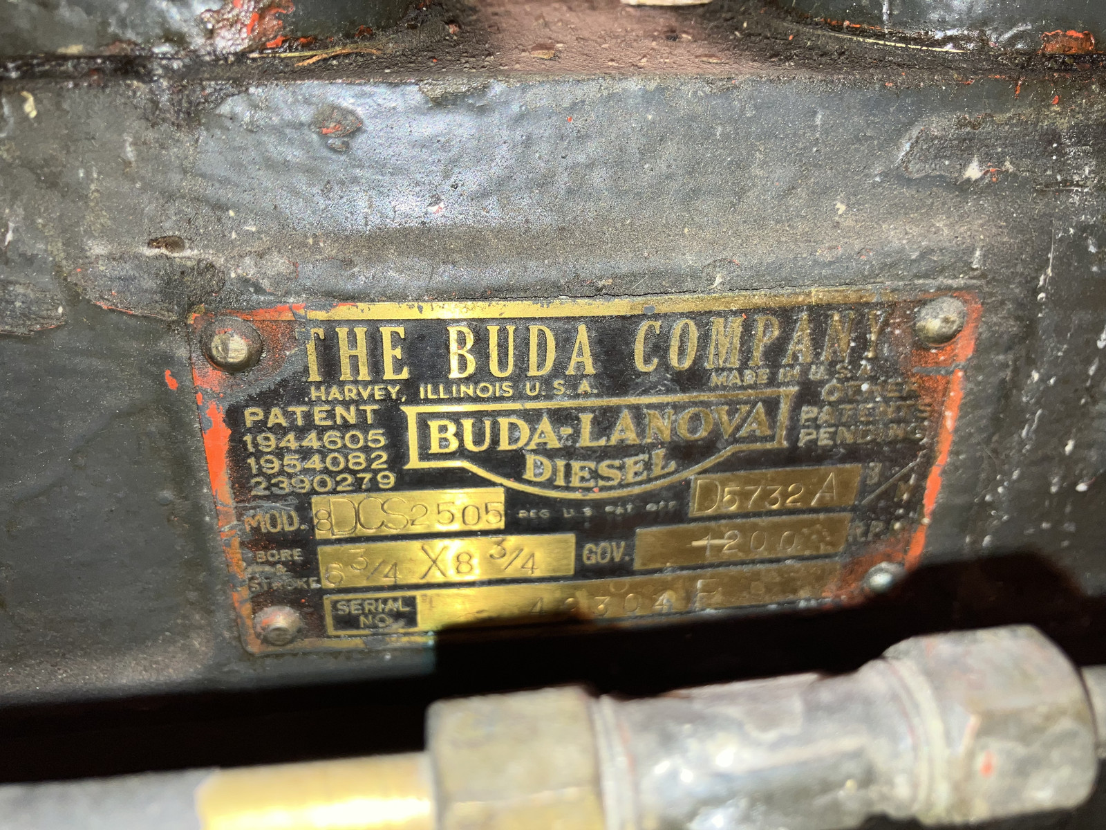 The engine is a Buda Diesel, 8DCS2505, with a 6 3/4” bore, and an 8 3/4” stroke, governed at 1200 RPM. I expect it’s quite loud!
