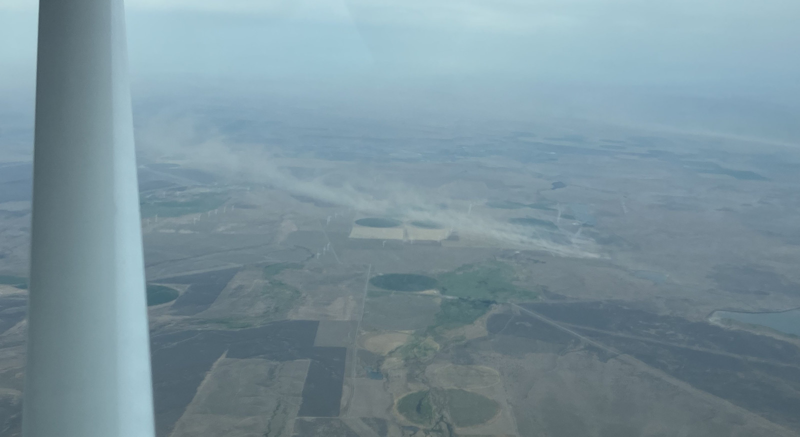 The last hour or so was certainly some of the most memorable flying I’ve done, and not in a good way - I’m glad I didn’t have any passengers, because there’s a very good chance they would have been using the barf bags. It wasn’t ever unsafe, but it was exceedingly uncomfortable flying, turbulence-wise. The skies went rapidly from “a thin cloud layer at 14k ft” to reporting “overcast at 7000, scattered at 5000,” and that was about right. I had to duck down fairly quickly to get below the cloud layer rolling in, which wasn’t too bad, though it was a good bit rougher down below. Unfortunately, the cold front was, well, cold. I’d been cruising around the freezing point up at 12,500, and after ducking down, the freezing point was around 7000 - which was fine, until I started seeing hints of rain. Freezing point, rain, airplane… nope. This was the first time I’ve ever used the pitot heat “in anger” (where I thought it might be actually needed), and I rapidly descended to warmer air, where the rain wouldn’t be a problem (not that it continued for more than brief periods). Unfortunately, the air down at 4000 feet or so was just violent. You can see the trail of dirt being blown off a field here - that’s not smoke, that’s dirt, and I assure you, the air up a bit higher was no nicer. It was nice to have the autopilot - though I hand flew things for a while as well, because at a certain point, the autopilot fighting everything just makes things worse. I was very much just keeping the airplane pointed in the general direction I wanted to go, and I decided that slowing down a bit would be a good idea, too - so I spent a while flying at Va (or the +/- 10 knots around it, in reality). This is a speed calculated such that the wing will stall before it overstresses the airframe, so it’s a good idea when getting pounded around. I don’t think I was ever anywhere near the airframe limits, but I certainly had some “Woaaaah…” low-G moments, and the reverse.